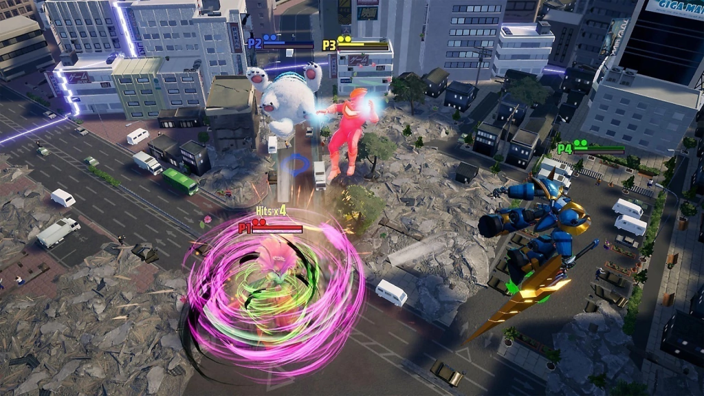 GigaBash combina o caos e a criatividade de títulos como Power Stone, Super Smash Bros e War of the Monsters com a escala estarrecedora dos filmes de kaiju clássicos.